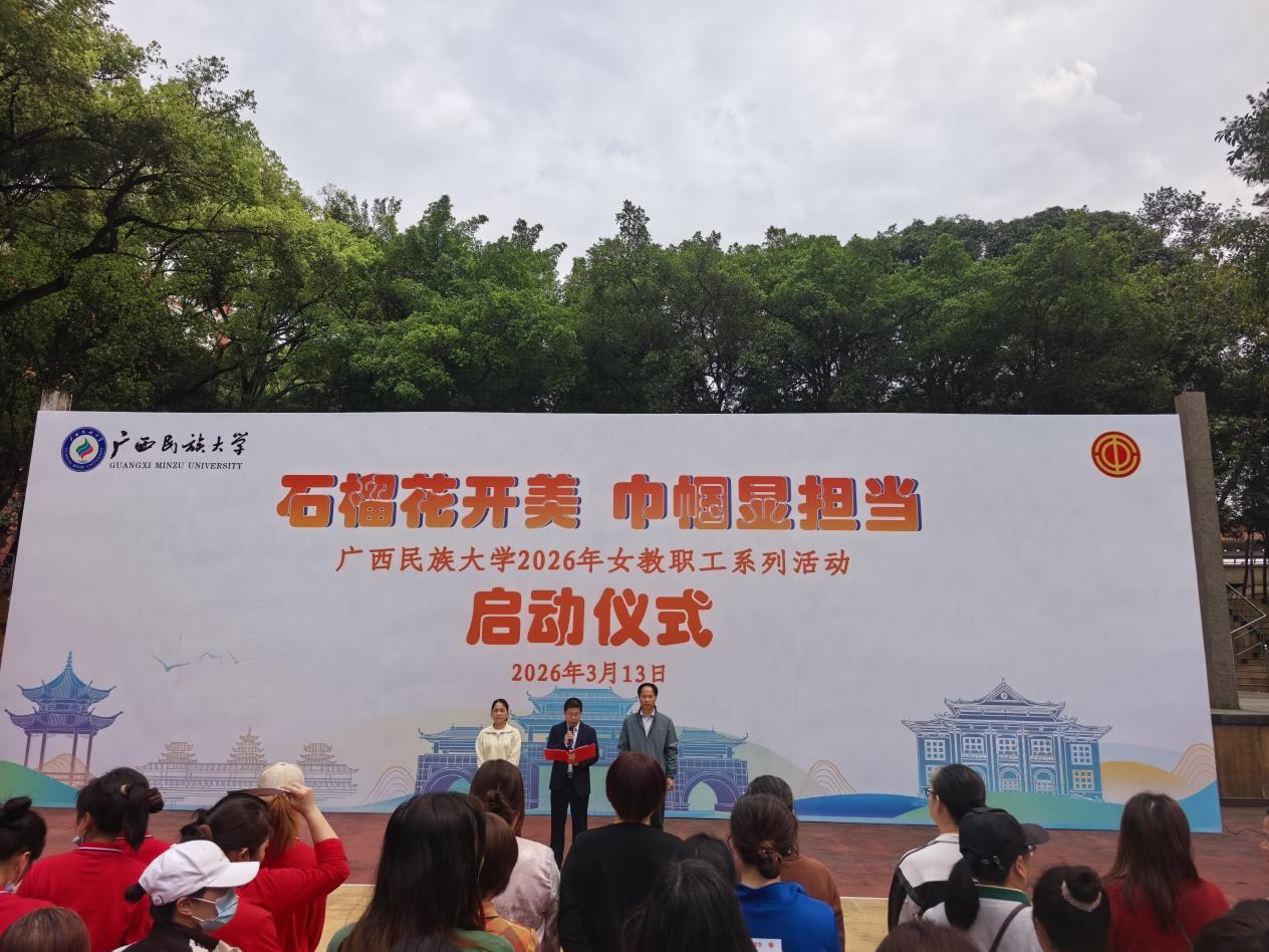 3月13日下午,广西民族大学在相思湖校区灯光球场举行“石榴花开美,巾帼显担当”素质拓展活动。学校党委副书记、工会主席邓国彬出席启动仪式,校工会有关负责人、600余名女教职工参与活动。