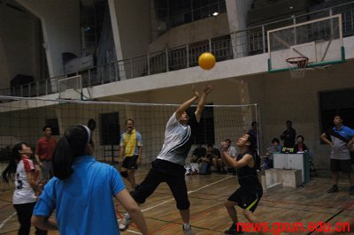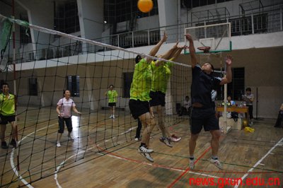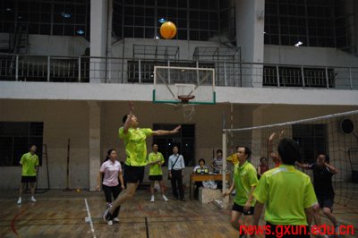 当天晚上,四个赛场内的八个小组参赛队都如火如荼地进行比赛。“好球!”国际教育学院队的队员又拿下了一分,他们相互击掌鼓励对方。在另一个赛场,管理学院1队正在和预科教育学院1队赛得热火朝天,队员们在赛场上奔跑救球,跳跃拦网,挥洒汗水,收获快乐。当对手开球时,每一个队员都注视着排球,双腿半蹲降低身体重心,稳住脚跟,目不转睛地盯着球,气势逼人。比赛吸引了不少学生观看,民族学与社会学学院的同学来到现场,给场上比赛的教职工加油鼓劲。(编辑:吴康君 校对:李盼盼)